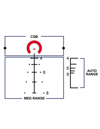 Siatka ma częściowe podświetlenie (podkowa i szewron) z opcją przełączania między 2 kolorami podświetlania, co pozwala na wybór barwy odpowiedniej do naszych preferencji i otoczenia. Podświetlenie o 10 stopniach (5 koloru czerwonego/5 koloru zielonego) zasilane baterią CR2032 może być pomocne przy szybkim strzelaniu cqb lub warunkach słabej widoczności.