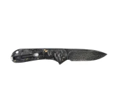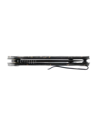 Rękojeść Civivi Elementum wykonano z połączenia włókna węglowego z płatkami złota zatopionymi w przezroczystej żywicy. Mieszanka jest lekka i niepodatna na uszkodzenia mechaniczne. Chropowata faktura okładzin sprawia, że nóż dobrze leży nawet w spoconej dłoni.